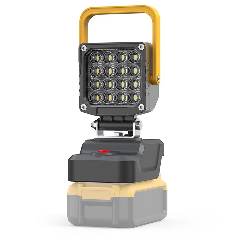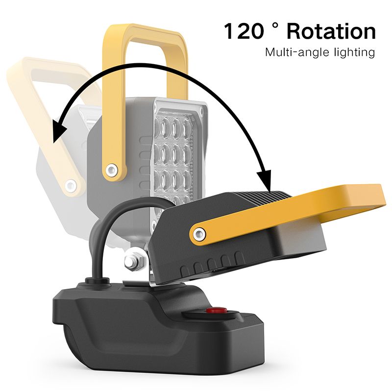 - Rotative Pivot: The cordless 4*4 led work lights is made up of two parts, upper part is configured with a 4*4 individual led reflective lens array, retatable up to 120 degree for multi-angle illumination, lower part is connected with rotative pivot to a ABS base compatible with DEWALT lithium battery.