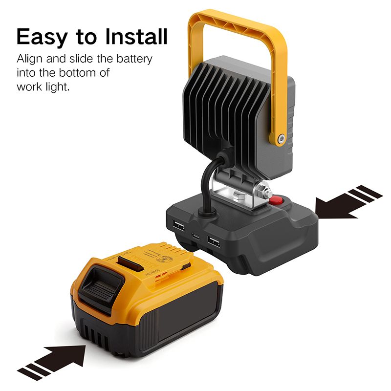 - Easy to Install: It’s easy to align and slide compatible DEWALT lithium ion battery module into the bottom slot of the handheld LED work lights.