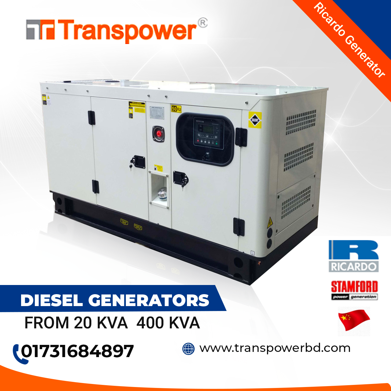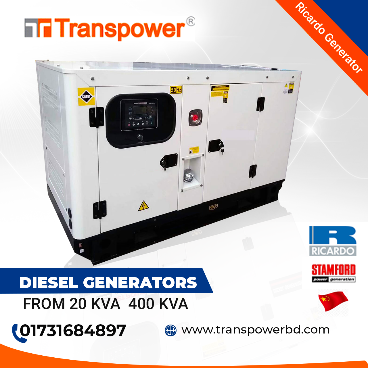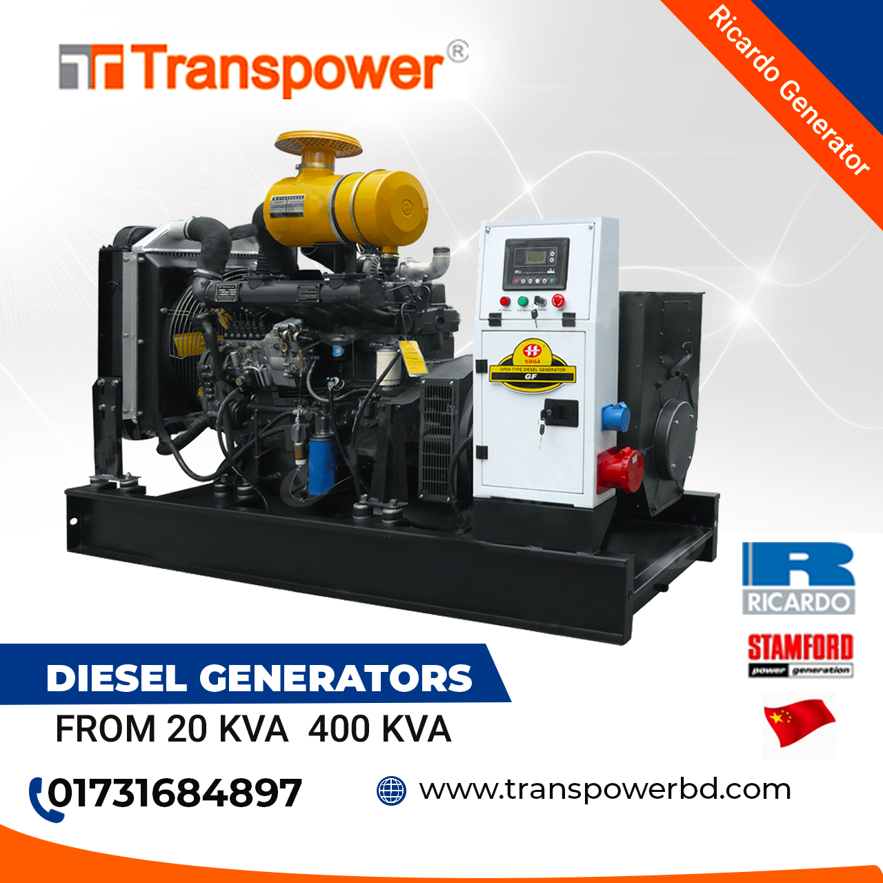 Engine: Ricardo, Origin: China. Output Voltage: 400/230V Frequency: 50 Hz Speed: 1500 rpm Power Factor: 0.8 Origin: China. Including: 01. Battery- 01 set. 02. Installation, Testing and Commissioning. 03. Transport free in Dhaka. PAYMENT TERMS: 100?sh/Cheque/pay order with confirm work order. DELLIVERY: From Ready Stock. INSTALLATION: Our package includes installation and commissioning of the Generator including load balancing for the premises where the generator is being installed. But does not including any cost of civil & electrical works which may be required for the installation of the generator. Installation free of cost within Dhaka City excluding materials (cable, pipes, Ear thing, Mobil, diesel, cooling water & civil work etc) which is mandatory to generator installation. Contact: Tell: 01766679701, 01731684897,01620484757.