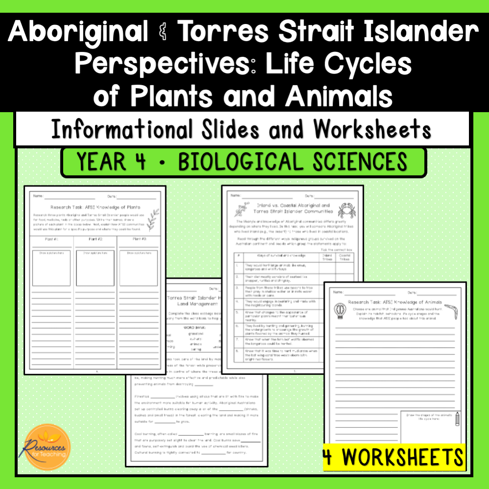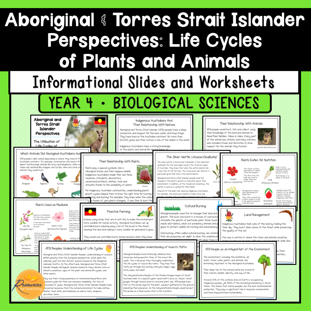 This resource is aligned with the Australian Curriculum for Year 4 students who are completing the Science unit Biological Sciences (ACSSU072 & ACSSU073) with a focus on investigating how Aboriginal and Torres Strait Islander Peoples understand and utilise the life cycles of certain species (OI.2, OI.3, OI.5) and recognising how they perceive themselves as being an integral part of the environment.