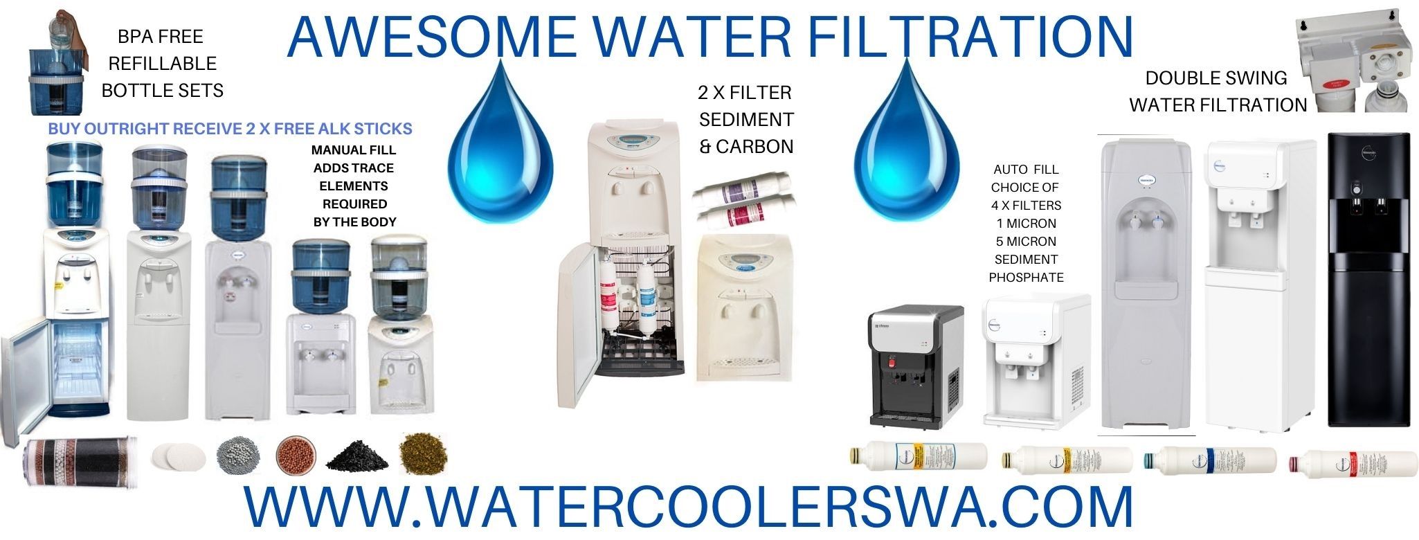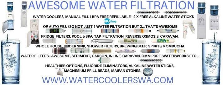 'WE ARE A E-COMMERCE STORE - WITH LIVE CHAT VIA WEBSITE. PLEASE VIEW OUR LARGE RANGE OF WATER FILTRATION OPTION FOR YOUR RESIDENTIAL, COMMERCIAL. CHOOSE EITHER WATER PURIFIERS, WATER COOLERS, MANUAL FILL OR AUTO FILL, FRIDGE WATER FILTERS, POOL & SPA WATER FILTERS, TAP WATER FILTRATION, REVERSE OSMOSIS, WHOLE HOUSE WATER FILTRATION, SHOWER WATER FILTERS, LARGE RANGE OF WATER FILTERS, PLUS HEALTHIER WATER OPTIONS, FLUORIDE ELIMINATORS, ALKALINE WATER STICKS, MAGNESIUM PRILL BEADS, MAIFAN STONES. MANUAL FILL BPA FREE -REFILLABLE RECEIVE 2 X FREE ALKALINE WATER STICKS THAT'S A SAVING OF $50.00 THAT'S AWESOME WATER COOLER AUTO FILL COME WITH A DOUBLE SWING WATER FILTRATION SO NOT JUST 1 WATER FILTRATION BUT 2... THAT'S AWESOME'