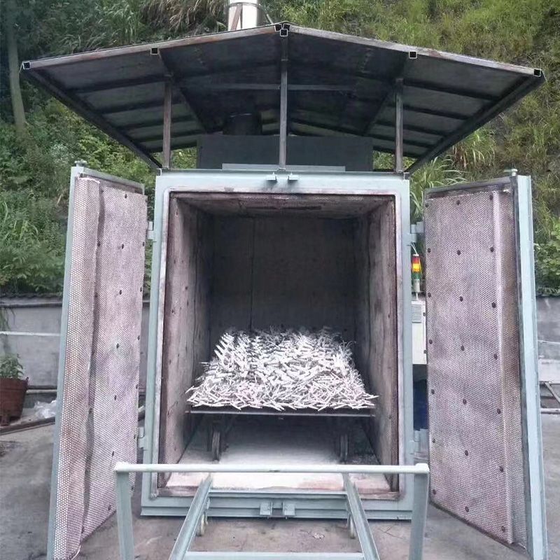 The Burn Off Oven has two relatively independent heating systems as well as temperature and smog control system. In the first heating system, the furnace chamber is heated to a certain temperature range, and the control system automatically controls the atmosphere in the furnace to gradually decompose the coating (organic matter) on the workpiece into gas. The control system always guarantees the decomposition speed, the decomposition product (gas) concentration and is strictly controlled within a certain range. When the organic waste gas generated by the decomposition product is converted into CO2 and water vapor discharging from the chimney through the full combustion of second combustion chamber at 700-900 degree, the remaining part of the furnace is workpiece and a small amount of inorganic substances which have become powdery. Most of them have fallen into the bottom of the furnace from the workpiece during the process, and only a small amount of the remaining can be shaken off or scrubbed with water. The burn off oven is mainly used for the decomposition and peeling of the cured organic coating and peeling of most steel (or iron casting) reprocessing workpiece surface coatings.