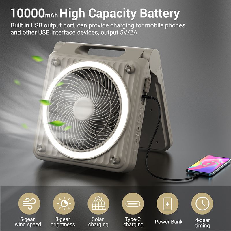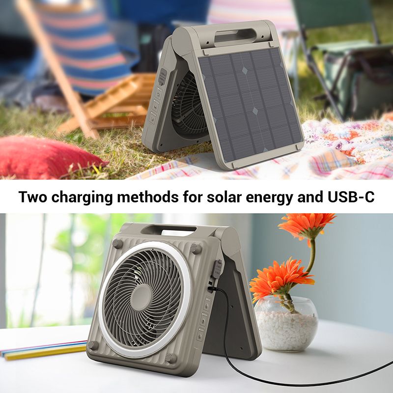 - USB Input/Output: With USB-A and USB-C port integrated, not only can this solar powered camping fan be charged via the solar panel, but via USB-C port, and charging your electronic devices via USB-A output power.