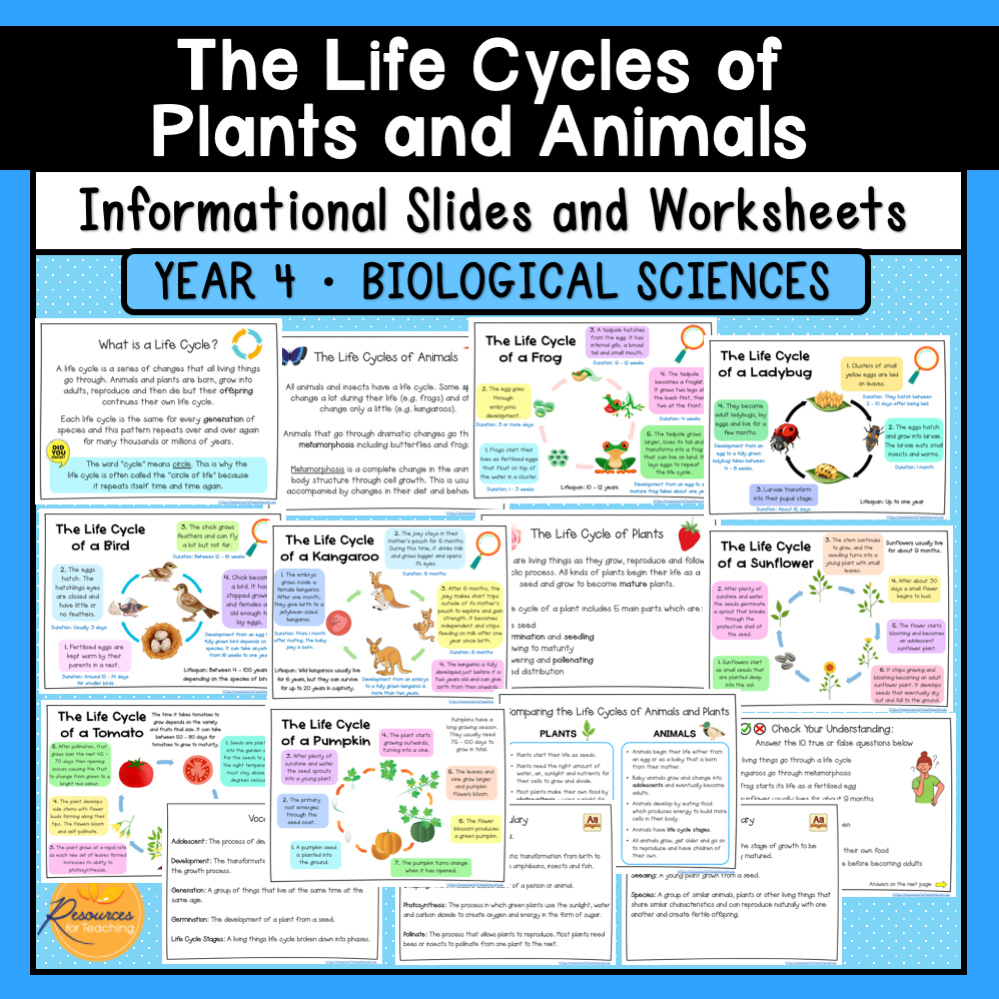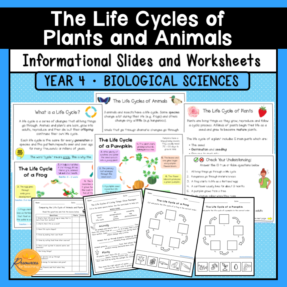 This is an excellent learning tool, aligned with the Australian Curriculum for Year 4 students who are completing the Science unit Biological Sciences (ACSSU072) with a focus on the life cycles of living things. These informational slides provide learners with knowledge that can be applied to the worksheets.