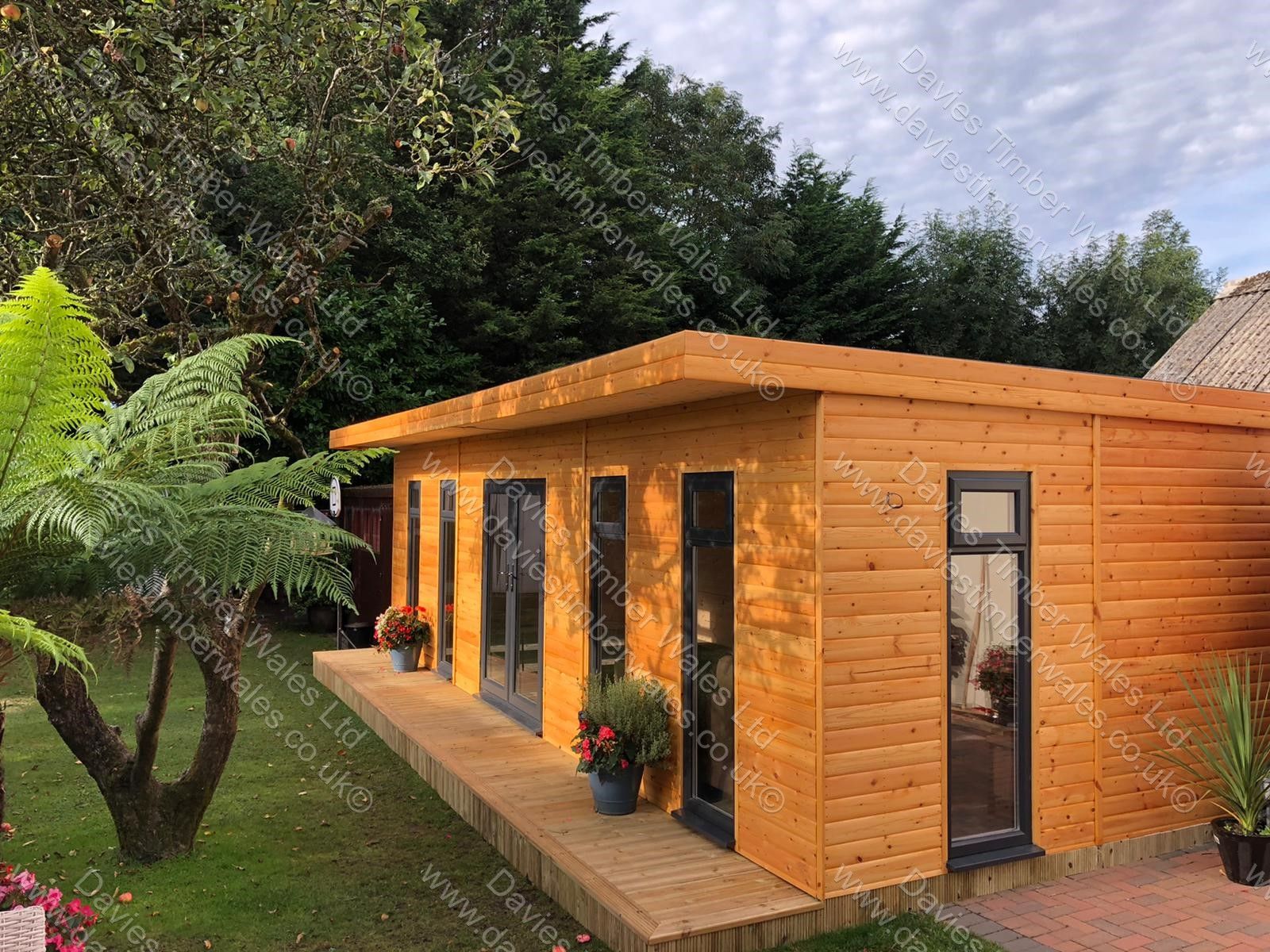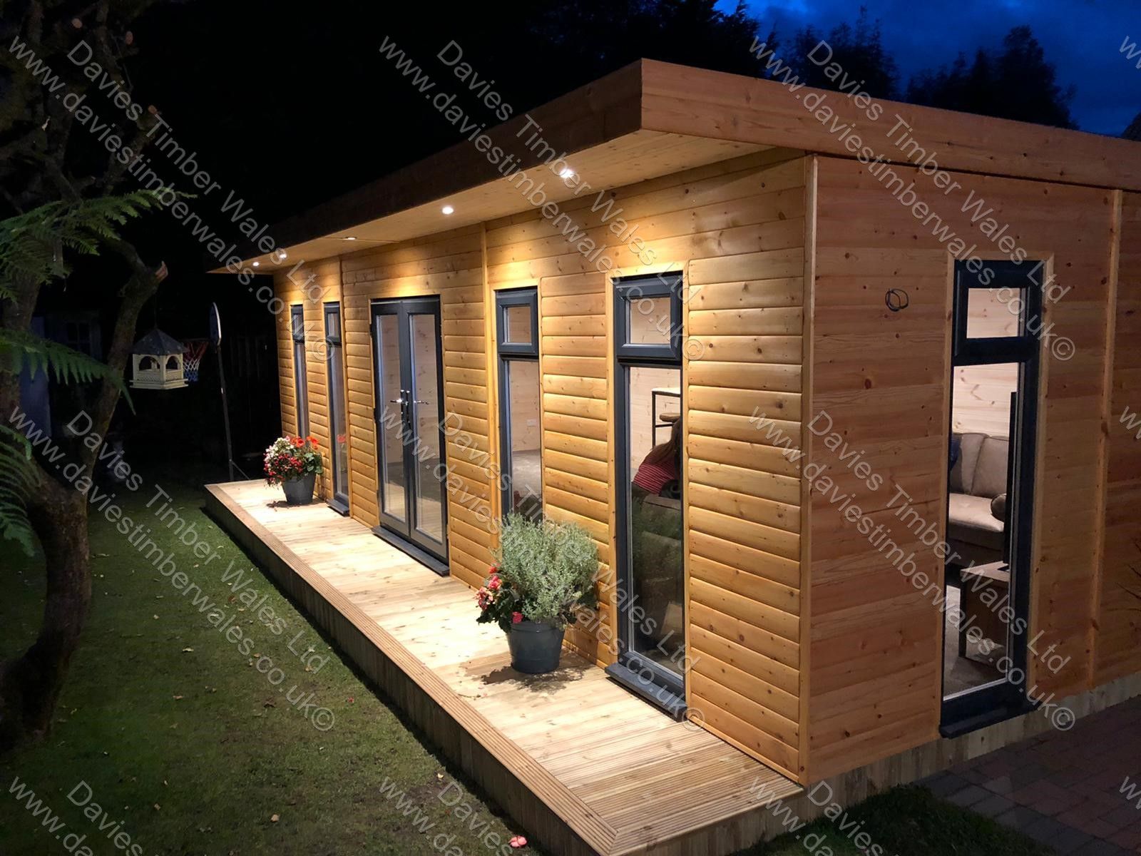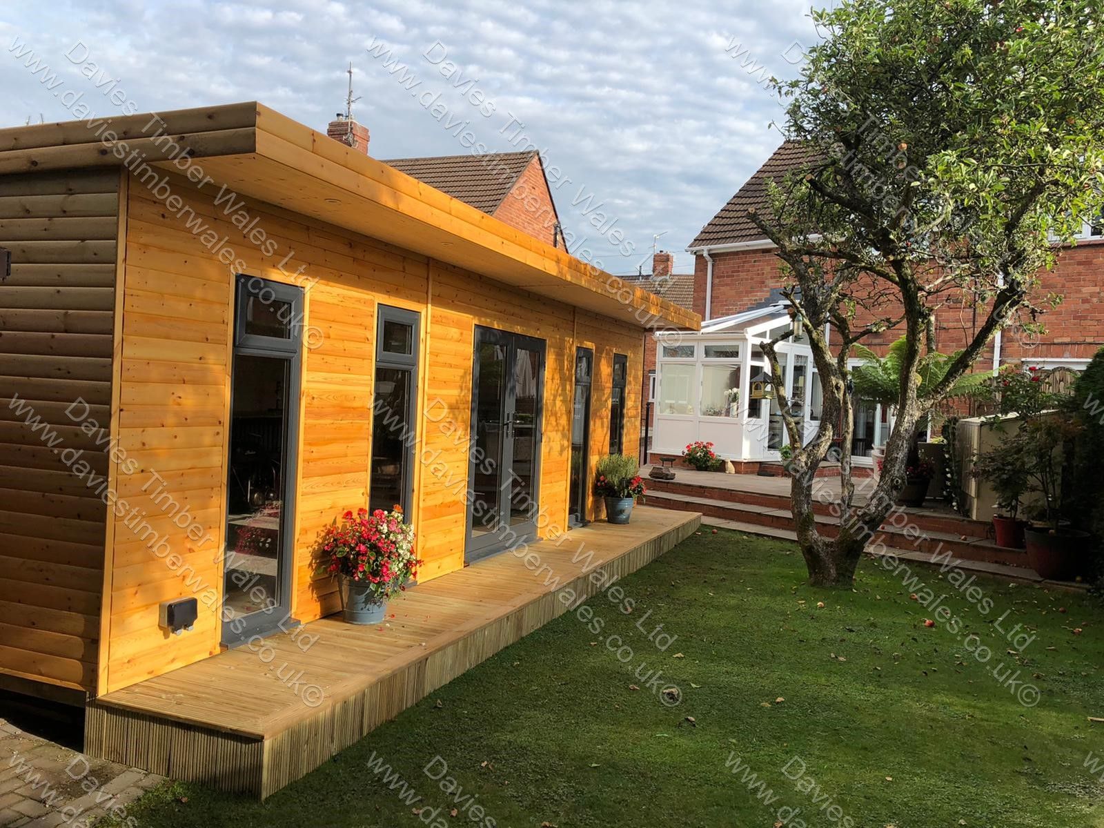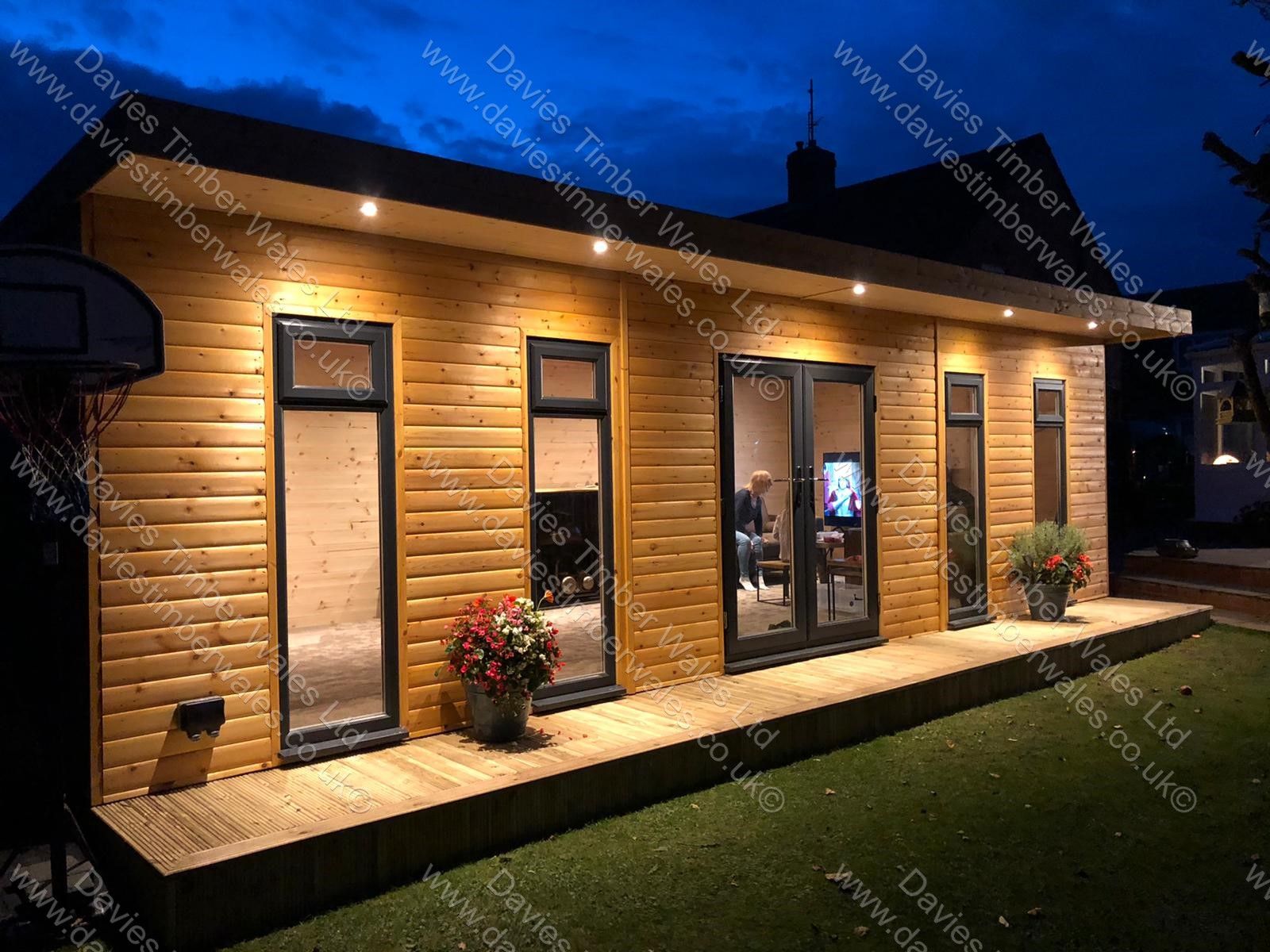 Garden Room, Log Lap 9m x 4.5m Pent Roof. Treated Autumn Gold, Timber Decking Area, Upvc Doors & Windows.